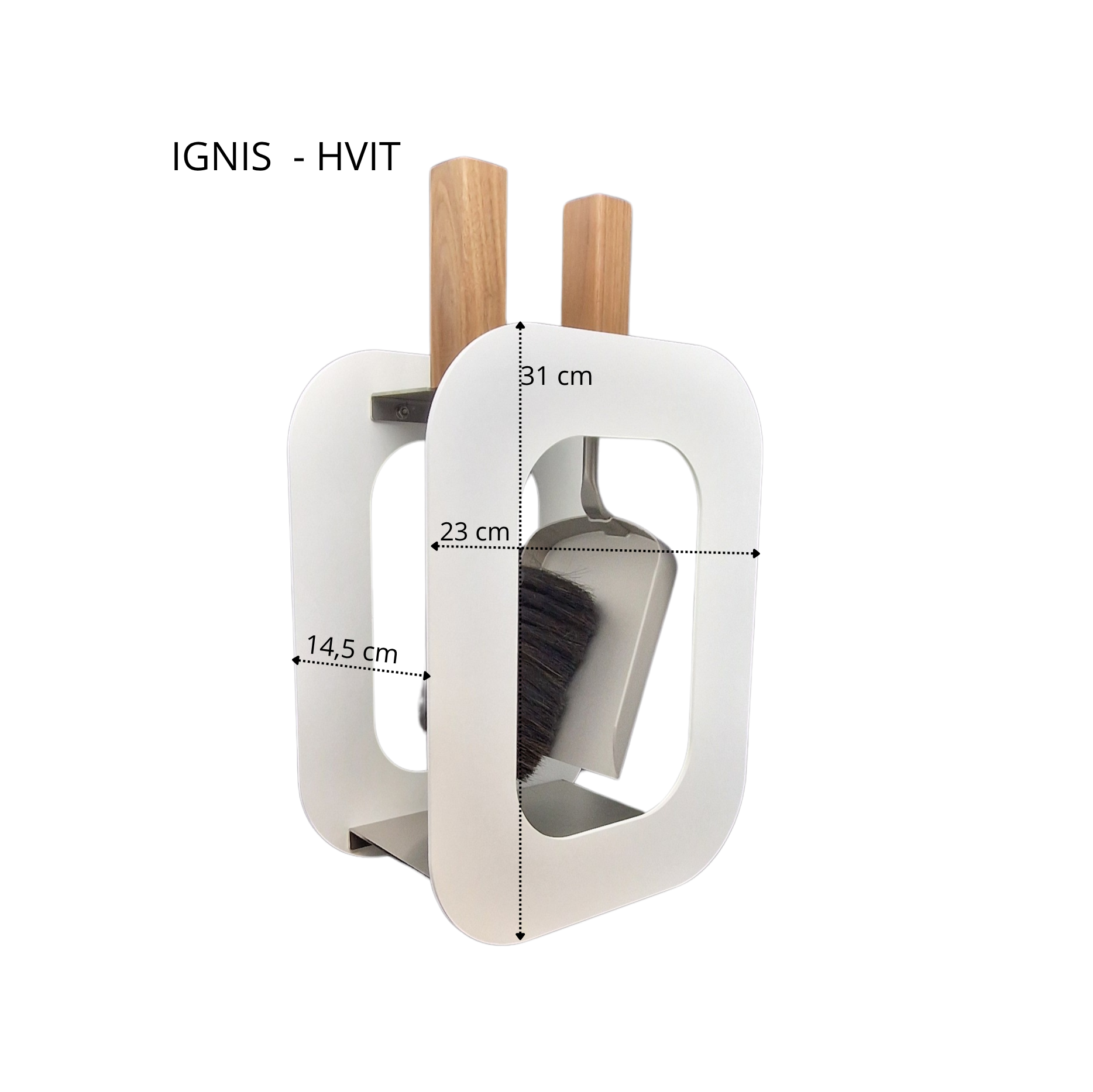IGNIS – er et kompakt, moderne peissett som kombinerer minimalistisk design med høy funksjonalitet. Settet består av en kost og en askespade, elegant plassert i en stilren ramme av stål med hvit finish. Håndtakene i naturtre gir et varmt, nordisk preg og sikrer godt grep under bruk.