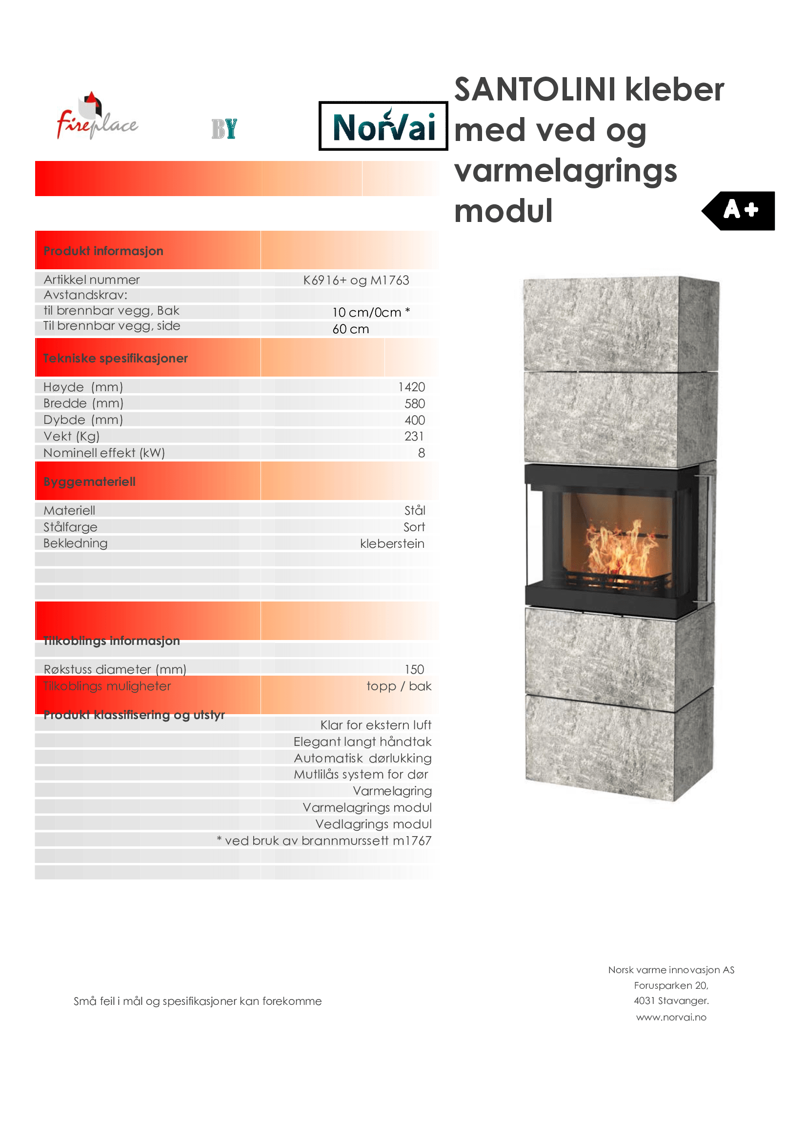 Ovnen er utstyrt med varmelagringssteiner, noe som gir en god og jevn varme etter fyring. Det følger også med en vedlagringsmodul, hvor du kan lagre veden.