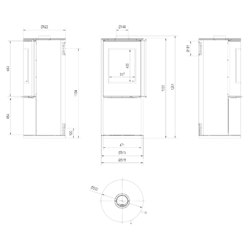 - Konstruksjon: Luftinntak, dekorativ glassdør, askeskuff, forbrenningskammer med innvendig fôr